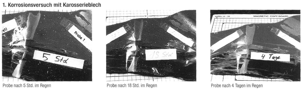 Der unten dargestellte Versuch zeigt, wie schnell ein Karosserieblech unter bestimmten Umständen korrodieren kann. Es wurde eine Probe aus einem Karosserieblech herausgeschnitten und so stark geknickt, dass der Decklack abplatzte, wie es auch bei einer Stauchung durch einen Auffahrunfall möglich wäre. Anschließend wurde die Probe bei feuchter Witterung ins Freie gelegt und nach fünf Stunden, nach 18 Stunden und nach vier Tagen Fotografiert. Es zeigte sich, dass nach bereits fünf Stunden leichter Flugrost zu erkennen ist. Nach 18 Stunden waren bereits etwa 20 % der Oberfläche angegriffen, nach vier Tagen war bereits mehr als die Hälfte der Oberfläche angerostet.